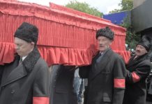 Борис решает уйти на войну. Нам показывают опорный пункт, где собираются добровольцы. Сцена снималась у московской школы в Армянском переулке, д. 4 (3). Как это ни удивительно, но и в реальности у средней школы № 644 в июне 1941 г. формировался истребительный батальон Куйбышевского района. Сегодня на здании висит мемориальная доска в память о тех страшных событиях начала войны. Здание этой школы в Армянском переулке стоит на месте храма Николы Чудотворца. Церковь снесли — в 1930‑е гг. была целая программа «На месте очага дурмана выстроим храм науки».